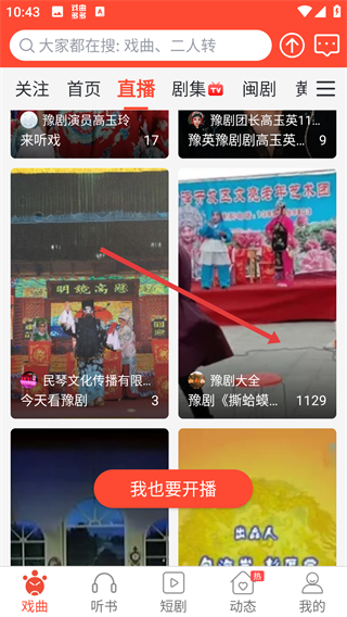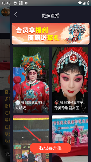 4、进入【更多直播】页面后,我们点击【我也要开播】,就能分享戏曲魅力给更多人啦。