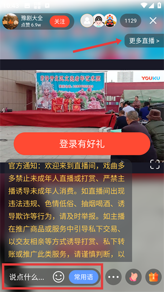 3、在直播间内,我们可以在底部输入框和其他戏迷互动交流,还可以点击【更多直播】。