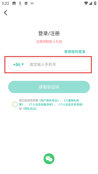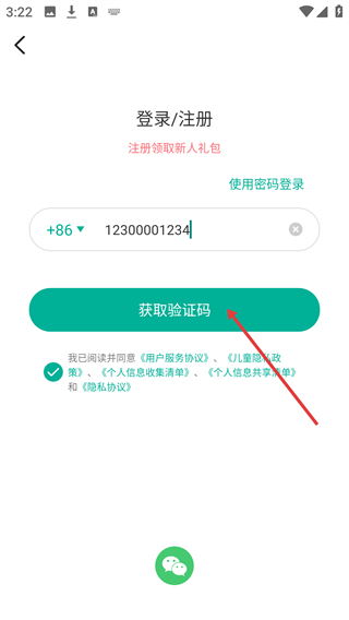 4、在【登录/注册】页填好手机号并勾选协议后,点击【获取验证码】按钮,即可获取登录所需的验证码。