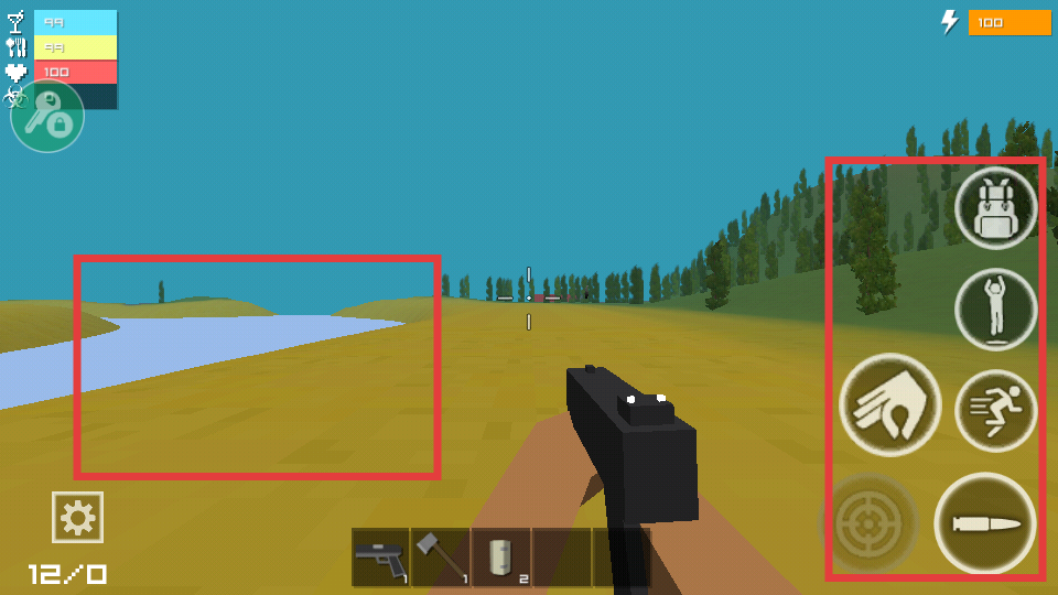 2、在场景中,可通过右侧功能按钮操控角色,探索包含河流、树林的区域,寻找资源和敌人。