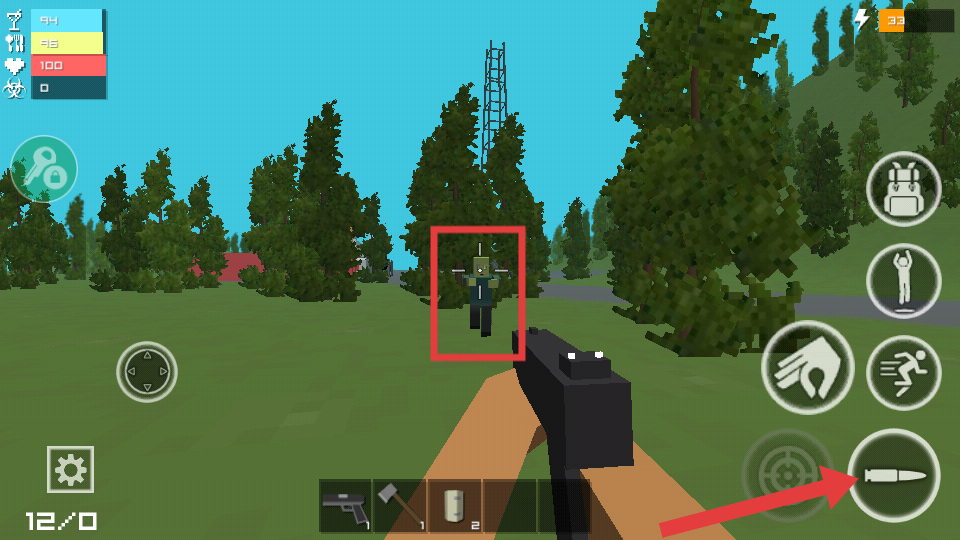 3、遇到僵尸时,点击射击按钮消灭它们,保障自身安全。