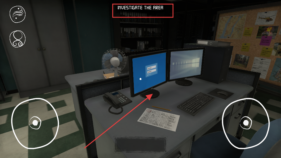2、探索办公桌区域,查看电脑、文件等元素,收集可能的线索,推进调查任务。