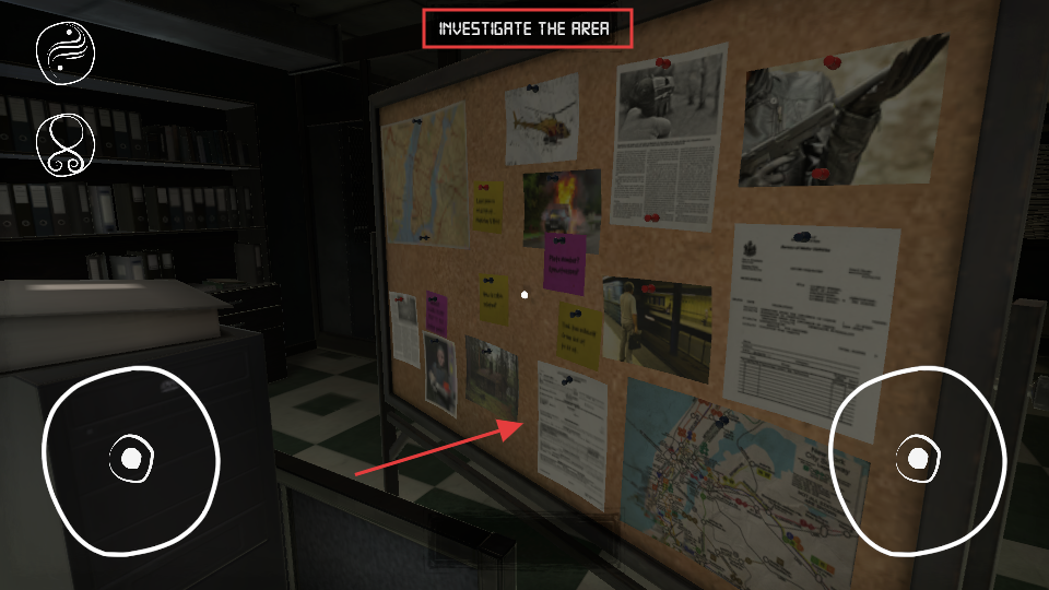 3、检查布告板上的地图、照片、文件等信息,分析其中的线索,为后续调查提供方向。