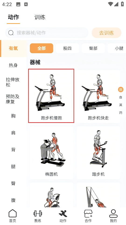 2、在动作页面选择【跑步机慢跑】,进入该动作详情页。