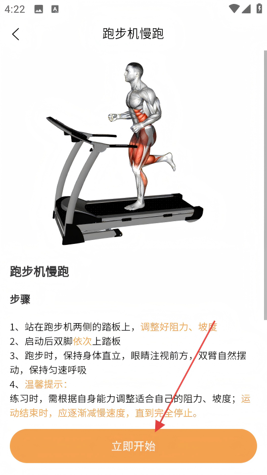 3、在跑步机慢跑详情页点击【立即开始】,进入训练页面。