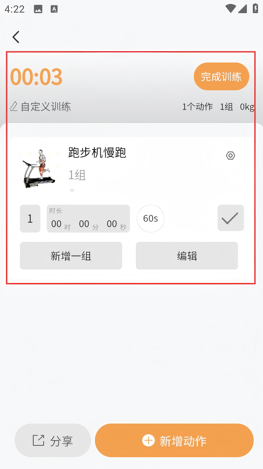4、在训练页面可查看训练时长等信息,进行跑步机慢跑的训练,完成后点击【完成训练】。