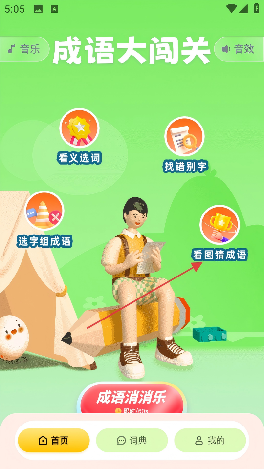 2、在首页点击【看图猜成语】,进入选择关卡页面。