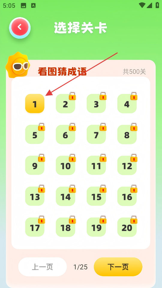 3、在选择关卡页面点击【1】,进入看图猜成语第1关答题页面。