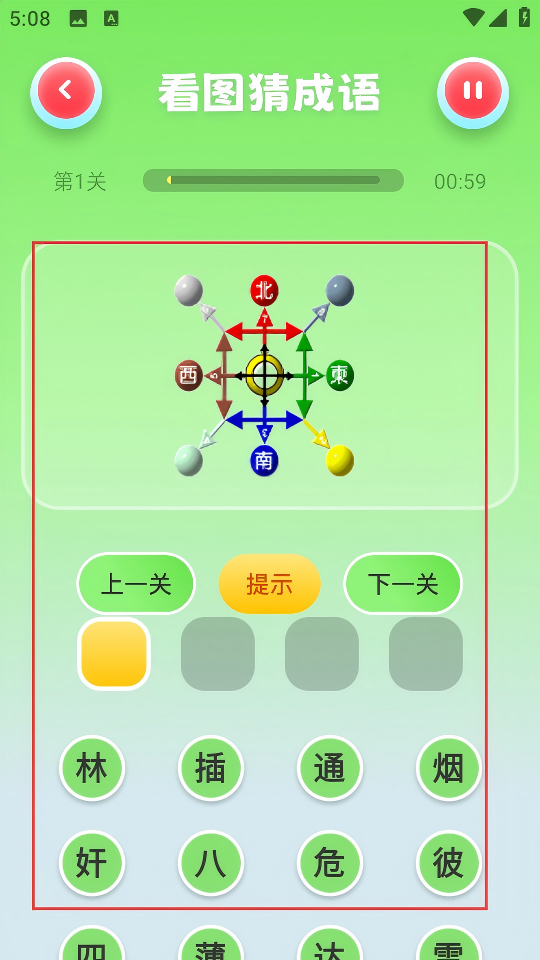 4、在第1关答题页面,根据图示选择文字组成成语,完成答题。