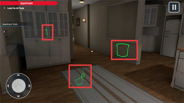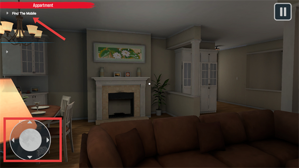 2、在【Apartment】场景中,根据【Find-The-Mobile】提示,通过左下角方向键控制视角移动,寻找目标物品。