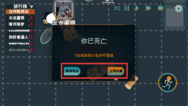 4、出现【你已死亡】提示时,若击杀数靠前可等晋级,也能选【立即结算】重置对局,或点【继续观战】学习技巧。