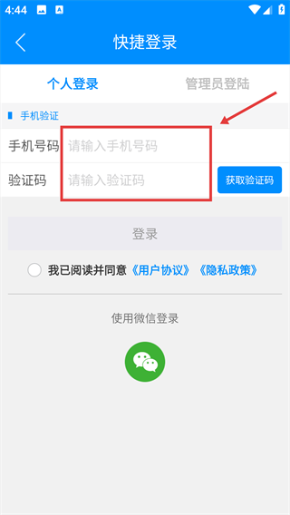 3、输入手机号和收到的验证码。