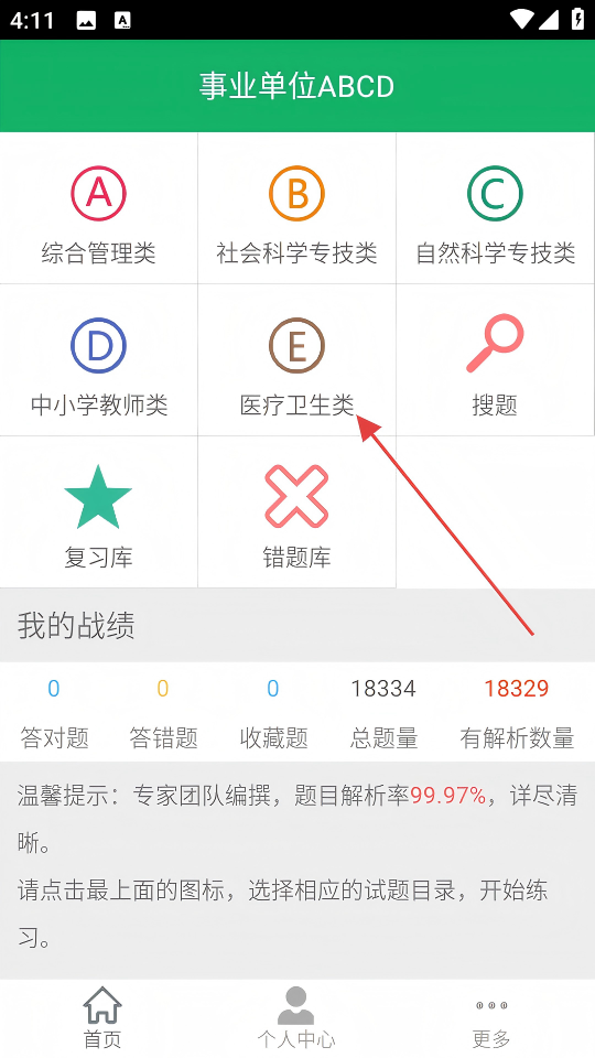 1、在首页点击【医疗卫生类】,进入医疗卫生类练习页面。