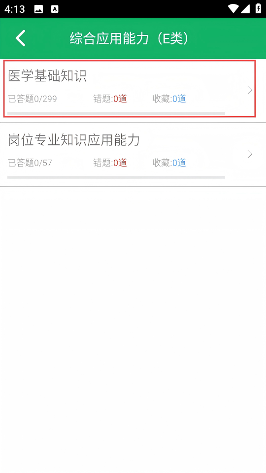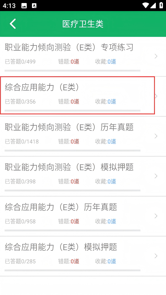 2、在医疗卫生类练习页面点击【综合应用能力(E类)】,进入该分类的练习子页面。