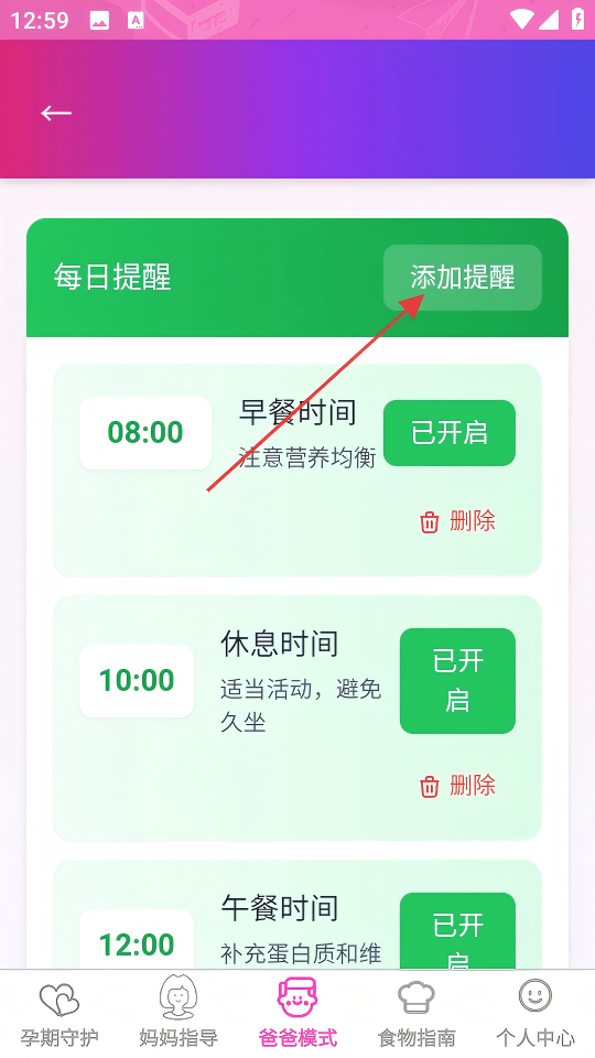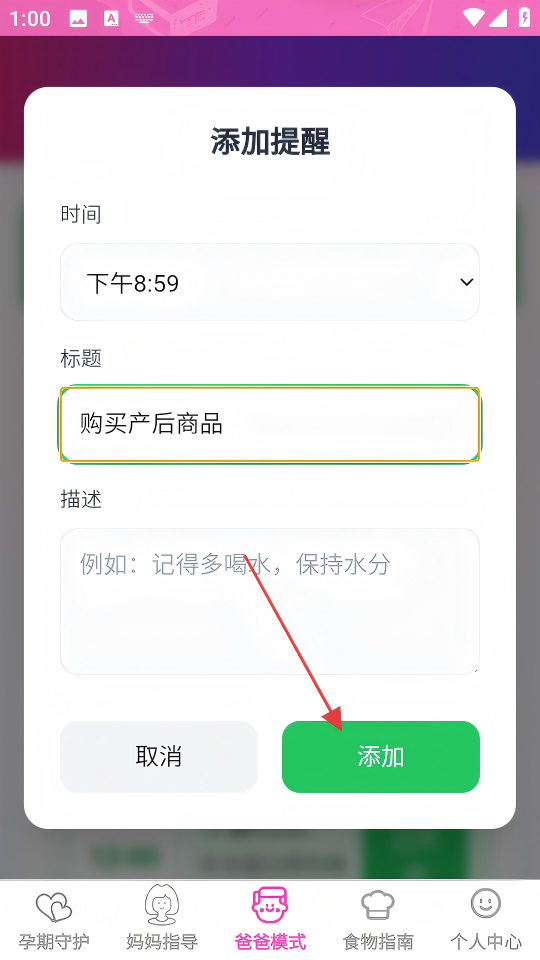 2、在爸爸模式页面点击【添加提醒】,弹出添加提醒的编辑框。