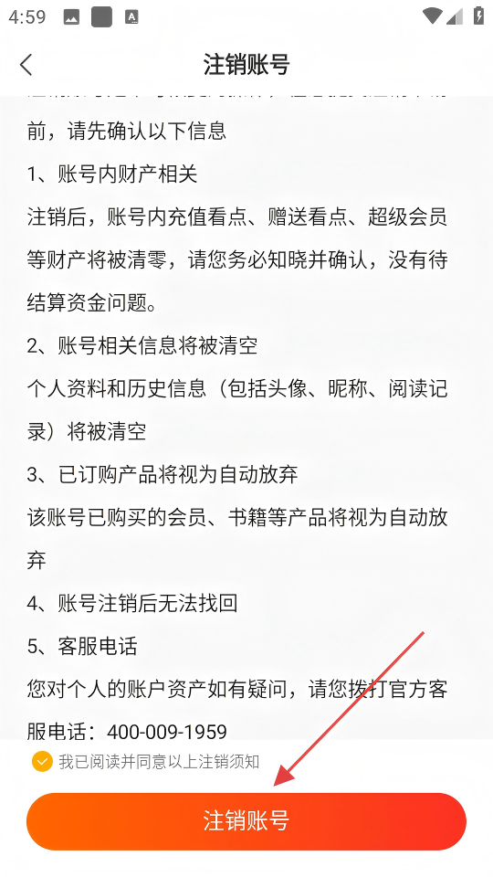 4、在注销账号说明页面,点击【注销账号】按钮,完成账号注销操作。