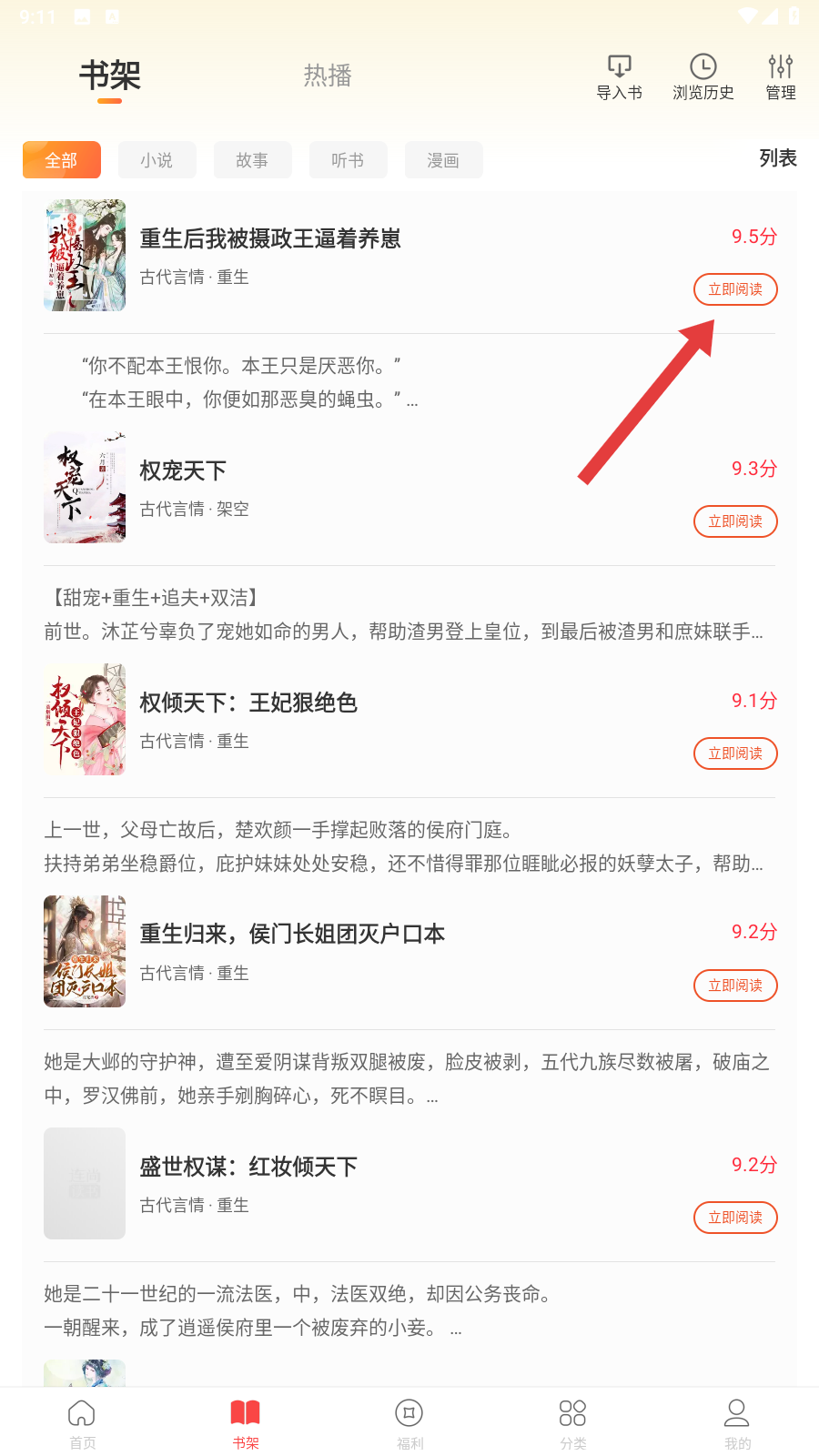 2、在书架中找到想读的小说,点击右侧【立即阅读】,就能进入阅读界面啦。