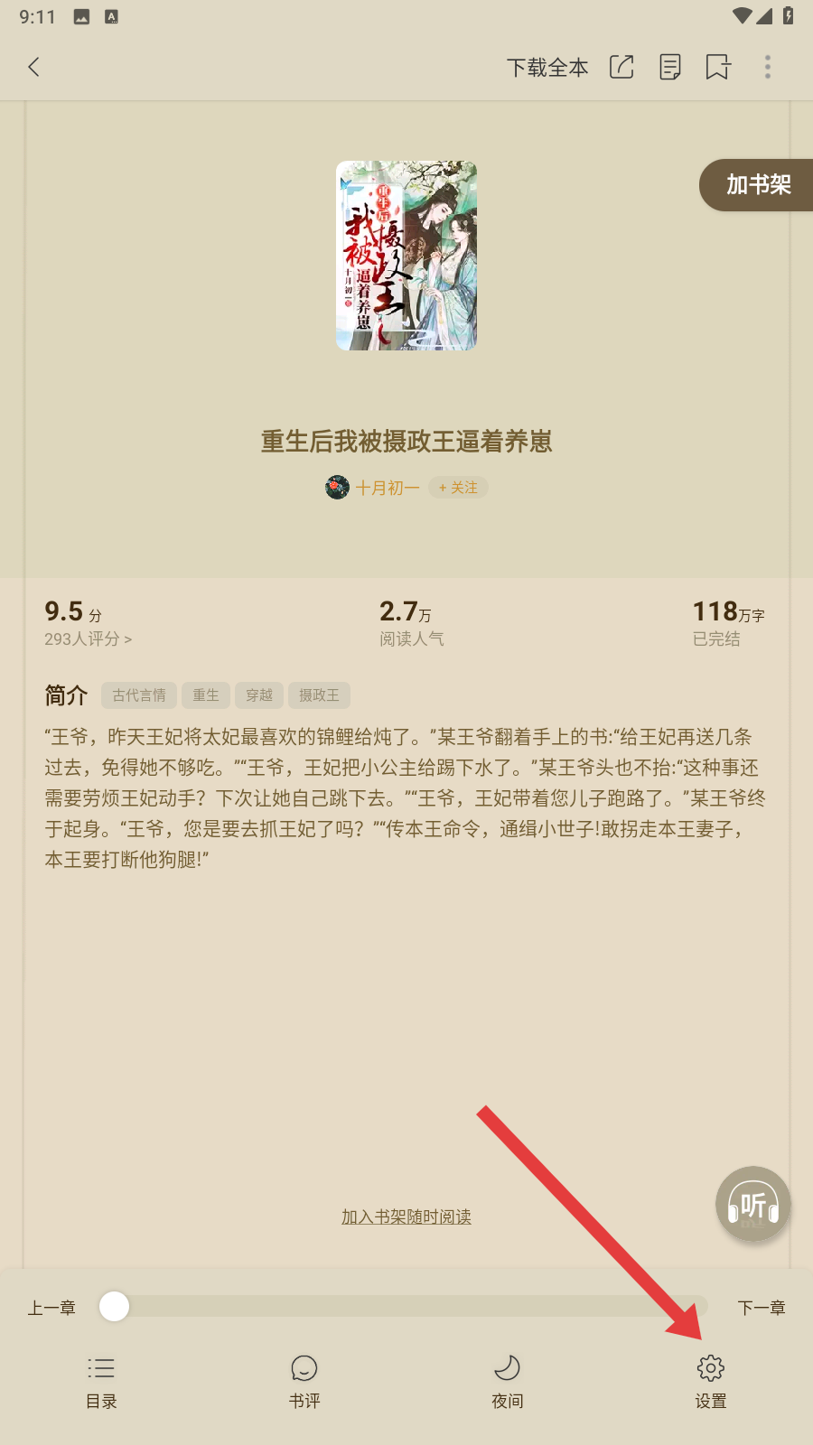 3、进入阅读界面后,点击右下角【设置】按钮,就能看到字体大小等阅读设置选项哟。