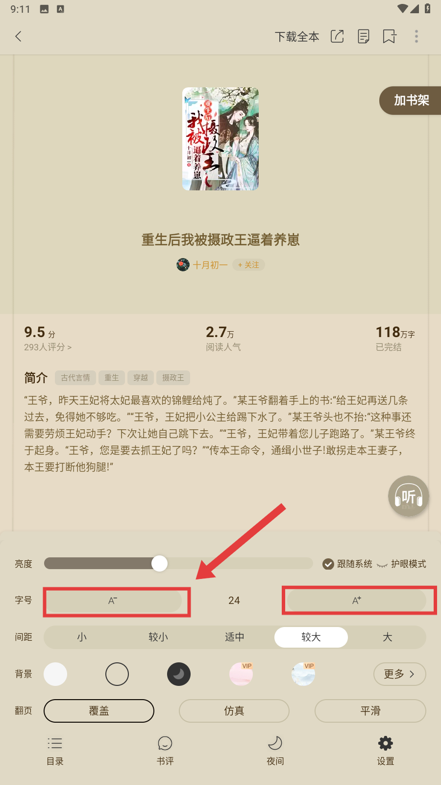 4、在设置里,我们可以点击【A⁻】缩小字号,点击【A⁺】放大字号,调整到自己舒适的阅读大小呢。