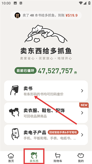 1、我们可以打开多抓鱼App,点击【卖东西】,选【卖书】,有条码的书可扫码查价哦。