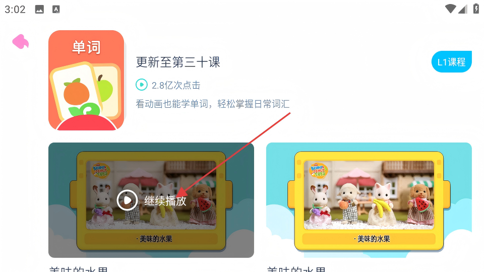 2、在单词学习页面,点击“继续播放”区域,进入学习模块选择页面。