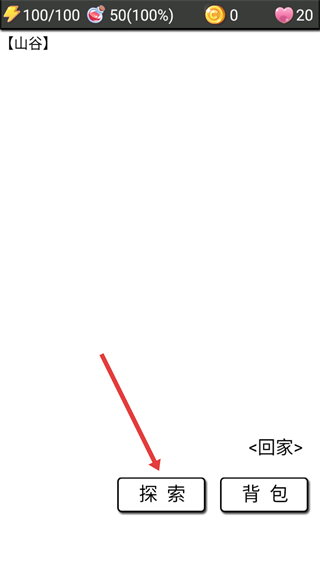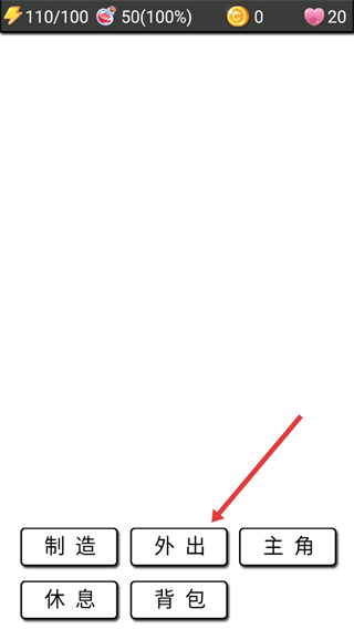 1、界面显示【110/100】状态时,可通过【外出】按钮探索野外。