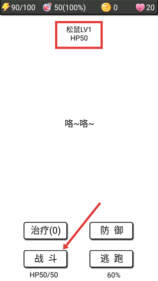 3、遭遇【松鼠LV1-HP50】时,选择【战斗】选项与其对战。