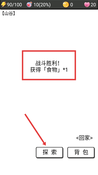 4、【战斗胜利】后可获得【食物*1】,接着点击【探索】继续在山谷中收集资源,推进游戏进度。