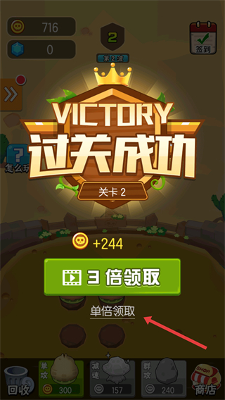 4、通关【关卡2】后,点击【单倍领取】获取【+244-金币】奖励,积累资源用于后续关卡植物种植。