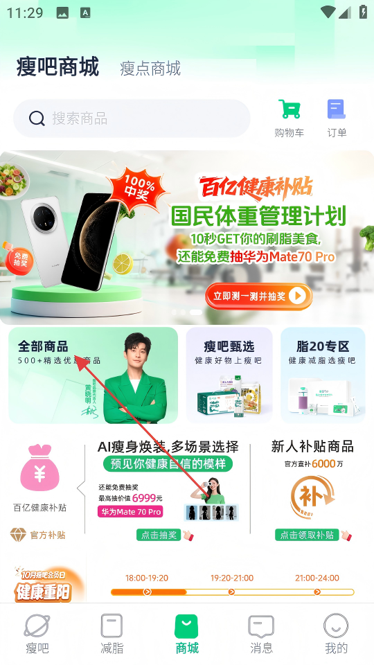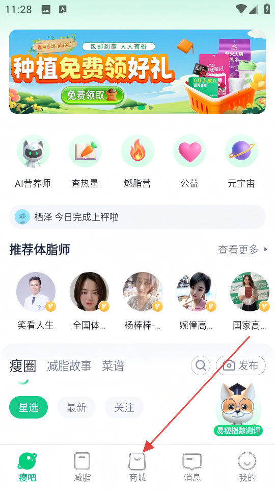 1、在瘦吧APP首页,点击底部【商城】选项,进入瘦吧商城页面。