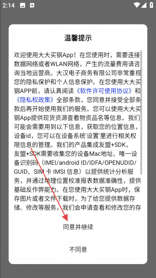 1、在大大买钢App的温馨提示弹窗中,点击【同意并继续】,进入应用首页。