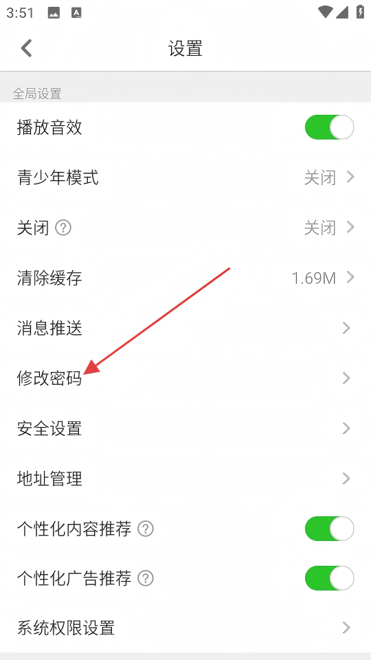 3、在设置页面,点击【修改密码】选项,进入修改密码页面。