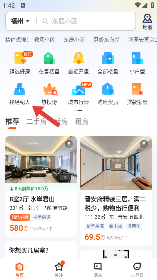 1、打开幸福里APP,在【首页】向左滑动寻找【找经纪人】图标。