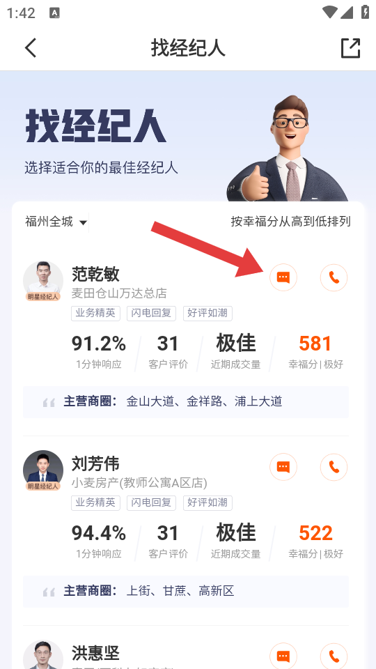 3、浏览经纪人列表,选择你想联系的经纪人,点击右侧的【对话气泡】图标,进入聊天界面。