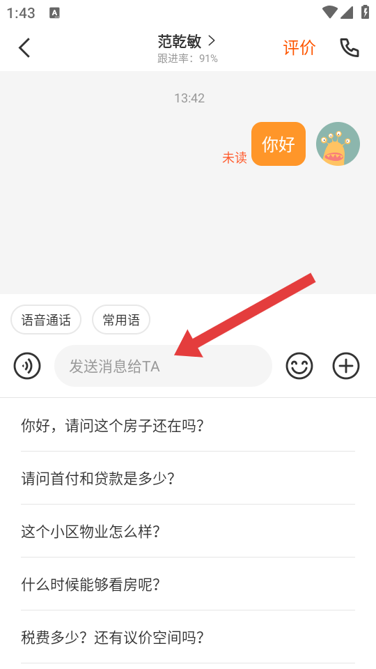 4、在聊天界面中,点击输入框,输入你想咨询的内容,然后发送即可与经纪人沟通。