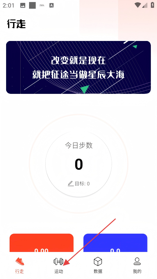 1、在行走页,点击底部【运动】按钮,进入运动页面。