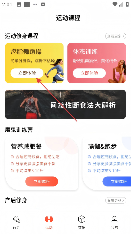 2、在运动课程页,点击【燃脂舞蹈操】的【立即体验】按钮,开始该运动课程的体验。