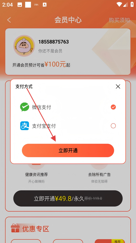 4、在会员中心的支付方式弹窗中,选好支付方式后,点击【立即开通】完成会员开通操作。