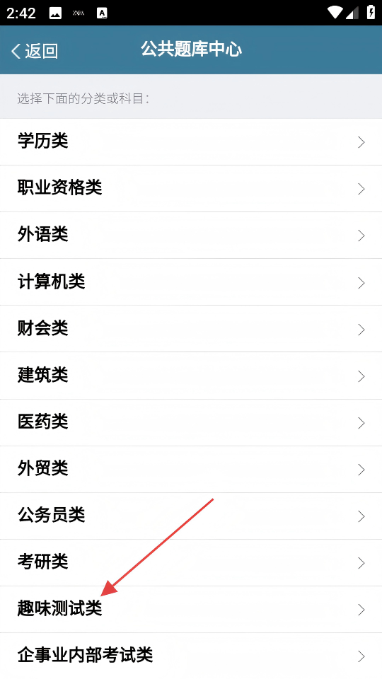 2、在公共题库中心页,点击【趣味测试类】选项,进入趣味测试的分类选择页面。