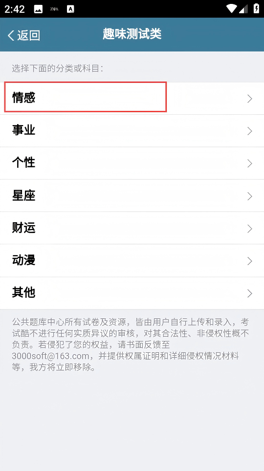 3、在【趣味测试类】分类页,点击【情感】分类,进入情感类趣味测试列表页面。