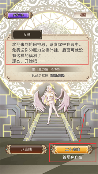 1、开局领取女神馈赠外挂,在种族轮回中选择剧情方向,搭配天赋加点应对冒险挑战。