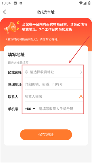 4、依次填写【区域选择】【详细地址】【联系人】【手机号】,完成信息填写后可保存地址。