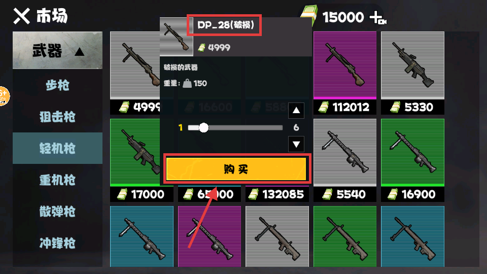 1、在市场轻机枪栏购买【DP-28(破损)】,消耗【4999】金币,增强初期战斗能力。