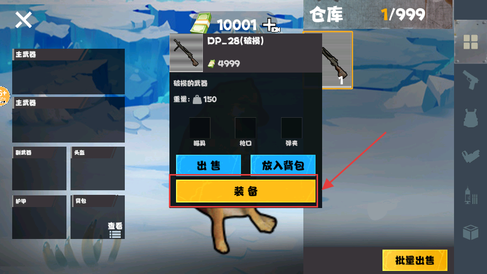 2、在仓库找到【DP-28(破损)】,点击装备按钮,将其配备为主武器,备战冒险。