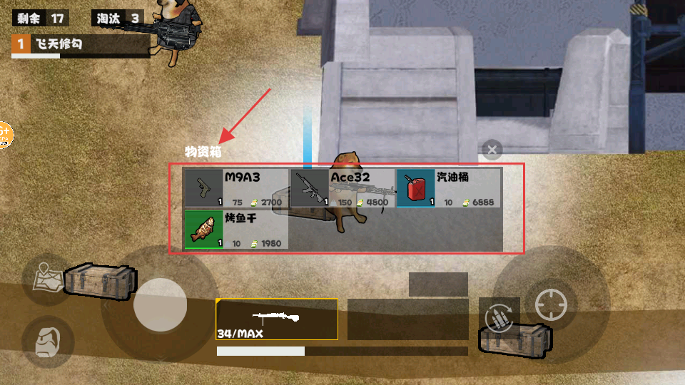 4、打开物资箱,优先拾取【M9A3】、【Ace32】枪械、【汽油桶】道具,或【烤鱼干】恢复状态。