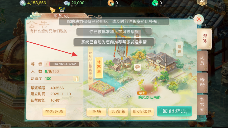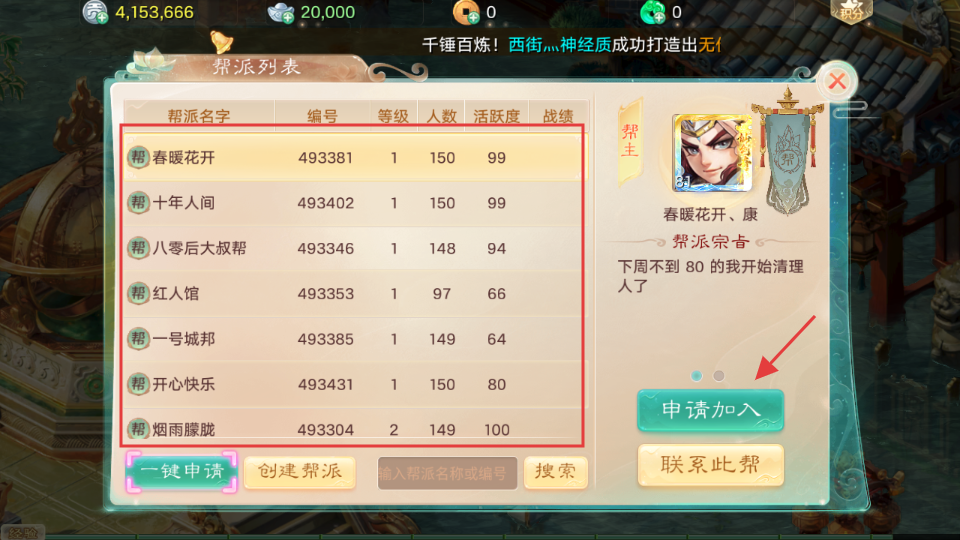 2、选择目标帮派,点击【申请加入】,待批准后加入该帮派。