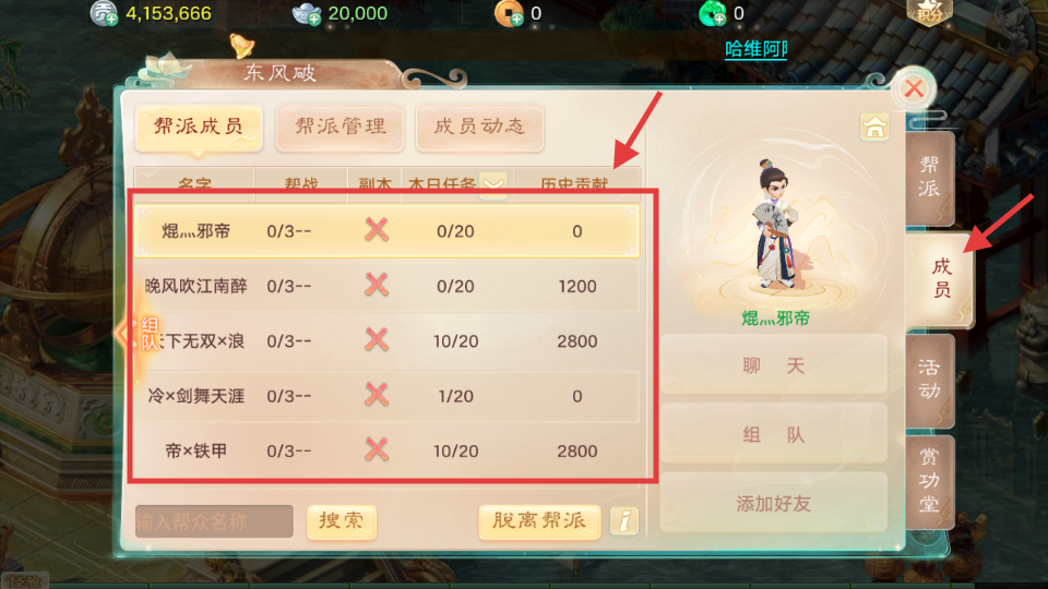 4、点击【成员】,可查看帮派成员的帮战、副本、历史贡献等详细信息。