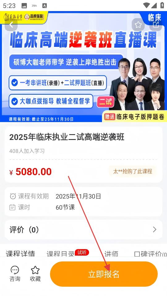 3、在课程详情页,查看课程信息后,点击【立即报名】按钮。