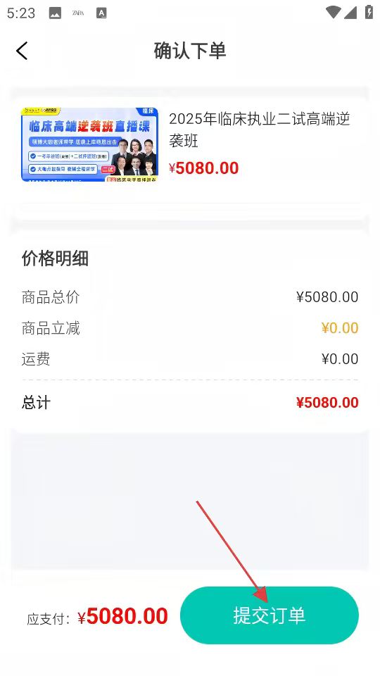 4、在【确认下单】界面,核对【价格明细】后,点击【提交订单】按钮完成课程订购。