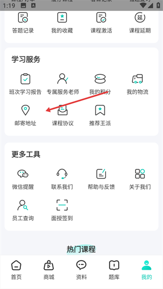 2、在个人中心的“学习服务”板块中,找到【邮寄地址】选项并点击。